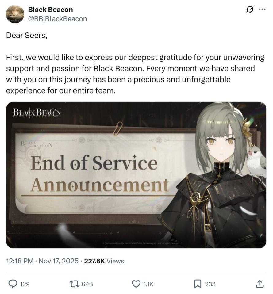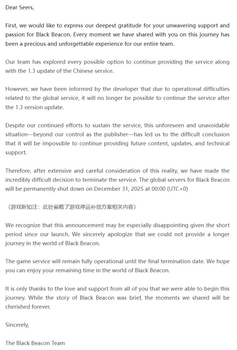 11 月 17 日,明昼科技旗下《黑色信标》国际服发布停运公告,宣告国际服将于 2025 年 12 月 31 日正式停运。「我们从开发者处获悉,由于全球服务相关的操作困难,1.3 版本后将不再可能继续服务……我们得出了一个艰难的结论,即不可能继续提供未来的内容、更新和技术支持。」