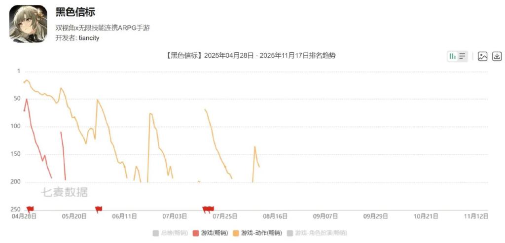 游戏海外版本《Black Beacon》在今年 4 月 10 日上线,由 Glohow 负责发行,表现一般。4 月下旬,《黑色信标》国服正式上线,由世纪天成负责发行,但开服当日就出现了大规模崩溃事件,而后成绩也相当一般,游戏最高冲到过 iOS 游戏畅销榜第 50 名,而后急速下滑,开服不到一月时间就查无此人。