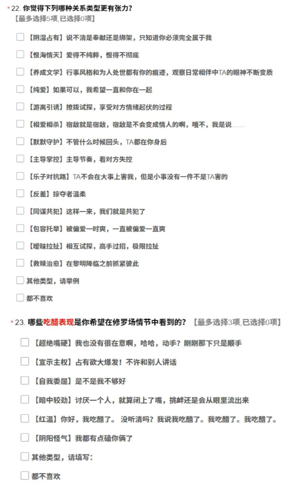 二测问卷则更有意思了,不仅细化的关系类型,而且还进一步讨论了角色之间复杂且丰富的情绪联系,从 " 阴湿占有 " 到 " 相爱相杀 ",再到 " 暧昧拉扯 " 与 " 救赎治愈 "......,毫不夸张地说,只要是大家想到的 "XP",都能找到对应选项,而这也最终很可能也会在游戏内看到。