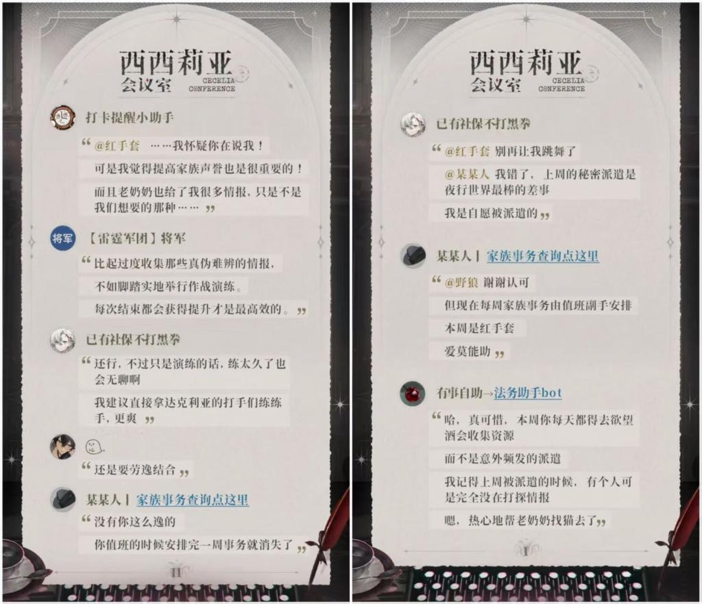 这个双关梗迅速被玩家捕捉,戏称这是 " 西西莉亚家族 BOSS 直聘 "。官方平时也顺势而为,在社区中着力刻画一个 " 现代化黑手党职场 " 的情景:流出的 " 西西莉亚家族内部会议记录 " 做得像一份飞书文档,与会成员有头像、有昵称,个人资料里还挂着可点击的蓝色链接。