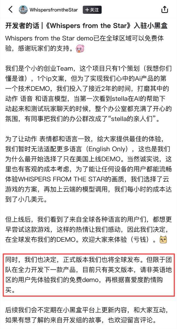 值得一提的是,《Whispers from the Star》的开发团队是蔡浩宇搭建的 Anuttacon 工作室,同时 Anuttacon 和《Whispers from the Star》也是 Varsapura 账号最早期仅有的两个关注。7 月 22 日,工作室层围绕游戏上线问题,发过一则声明,大致意思是:《Whispers from the Star》之所以做到的事情有限,是因为团队正在全力开发下一款产品。